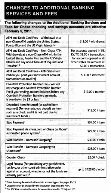 Just a brief post to share the notice Chase Banks sent their loyal checking customers regarding fees for their checking accounts. Chase has decided that if you don't make a SINGLE direct deposit of $500 every month, they will charge you $12. Note that it is a SINGLE deposit of $500, weekly or bi-weekly deposits of $499 don't count. So they've effectivly killed their free checking accounts.Rather than type in all the BS on their notice, here's some scans that explain exactly HOW they plan to stick it to you, and the limited ways you have to avoid the fees.